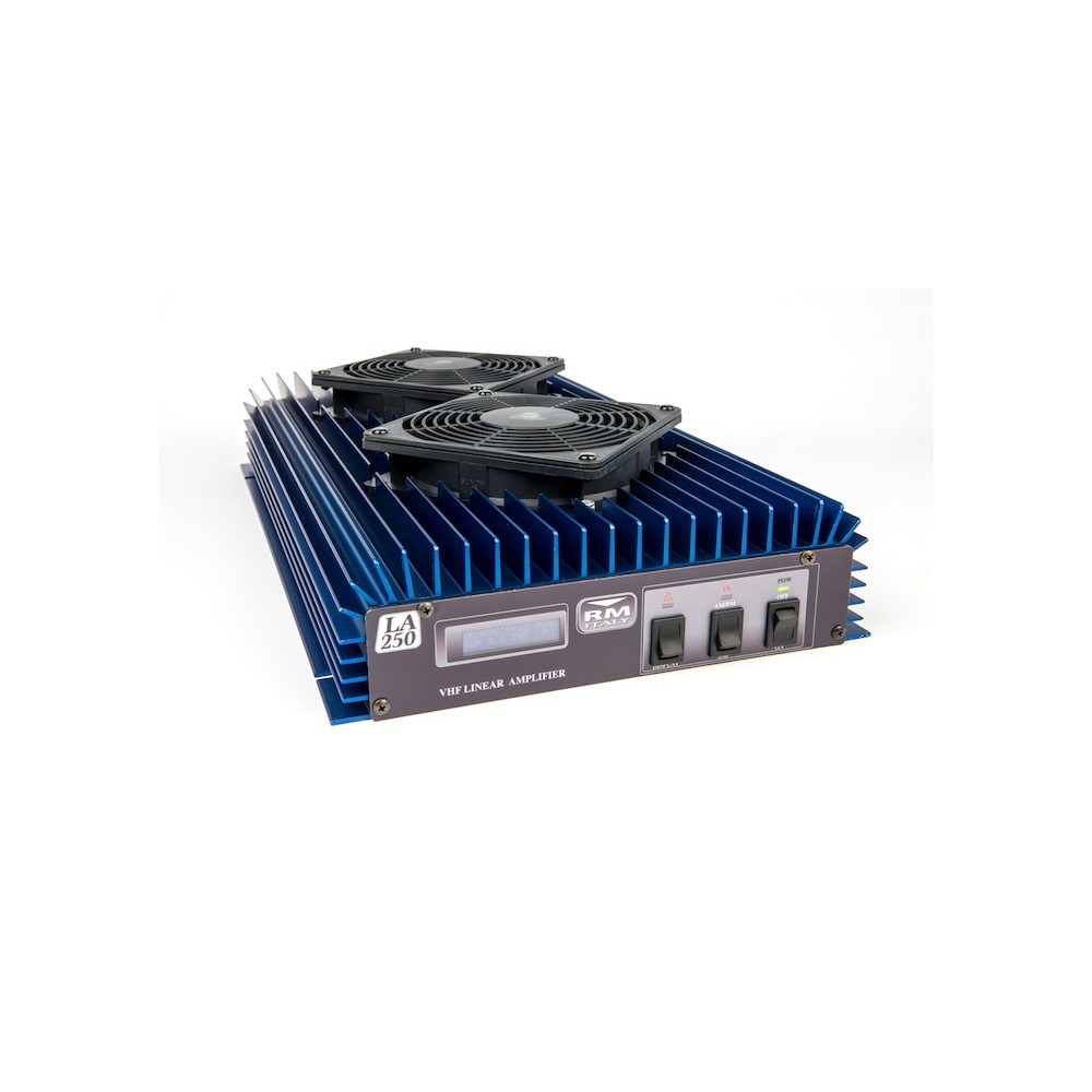 { Le LA-250V est un amplificateur 200W 140-150MHz, à 1 à 20W d'entrée (13.6v 30a). Il utilise 4 Mitsubishi RD70 MOSFET monté sur un diffuseur de chaleur en cuivre (200x60x3 mm). Il est disponible en deux versions, une avec et une sans ventilateurs montés. Il y a une entrée PTT externe mais elle peut également être utilisée sans incorporation de HF-VOX. {