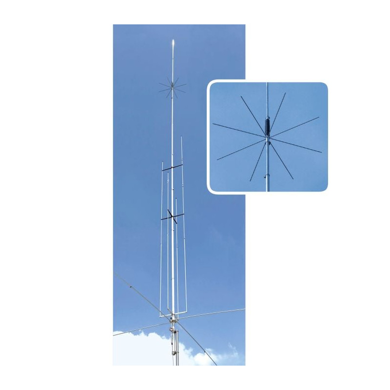 Like all Grazioli antennas, the MV7 stands out for its construction quality: alloy radiator AW6063-T66 (CNC machined), stainless steel (AISI-304/316) clamps and screws, UV-resistant molded insulators. Wind resistance up to 130 km/h (with guy lines), total height 8.97 m, weight 8.5 kg.