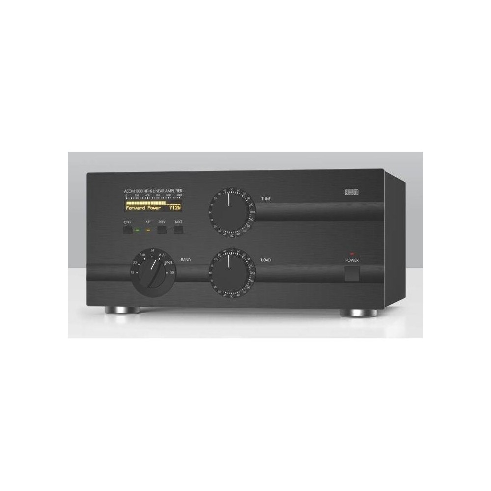 El amplificador postena acom 1000 tiene una pantalla LCD retroiluminada que muestra mensajes de texto, uno de los 12 parámetros y un gráfico de barras para la potencia de salida máxima. Los LED adicionales indican varios estados operativos, como "Operación", atenuador y encendido/apagado. El ACOM-1000 es totalmente compatible con BK (QSK) y ofrece 1000 W de potencia en todas las bandas de radioaficionados de 160 m a 6 m.