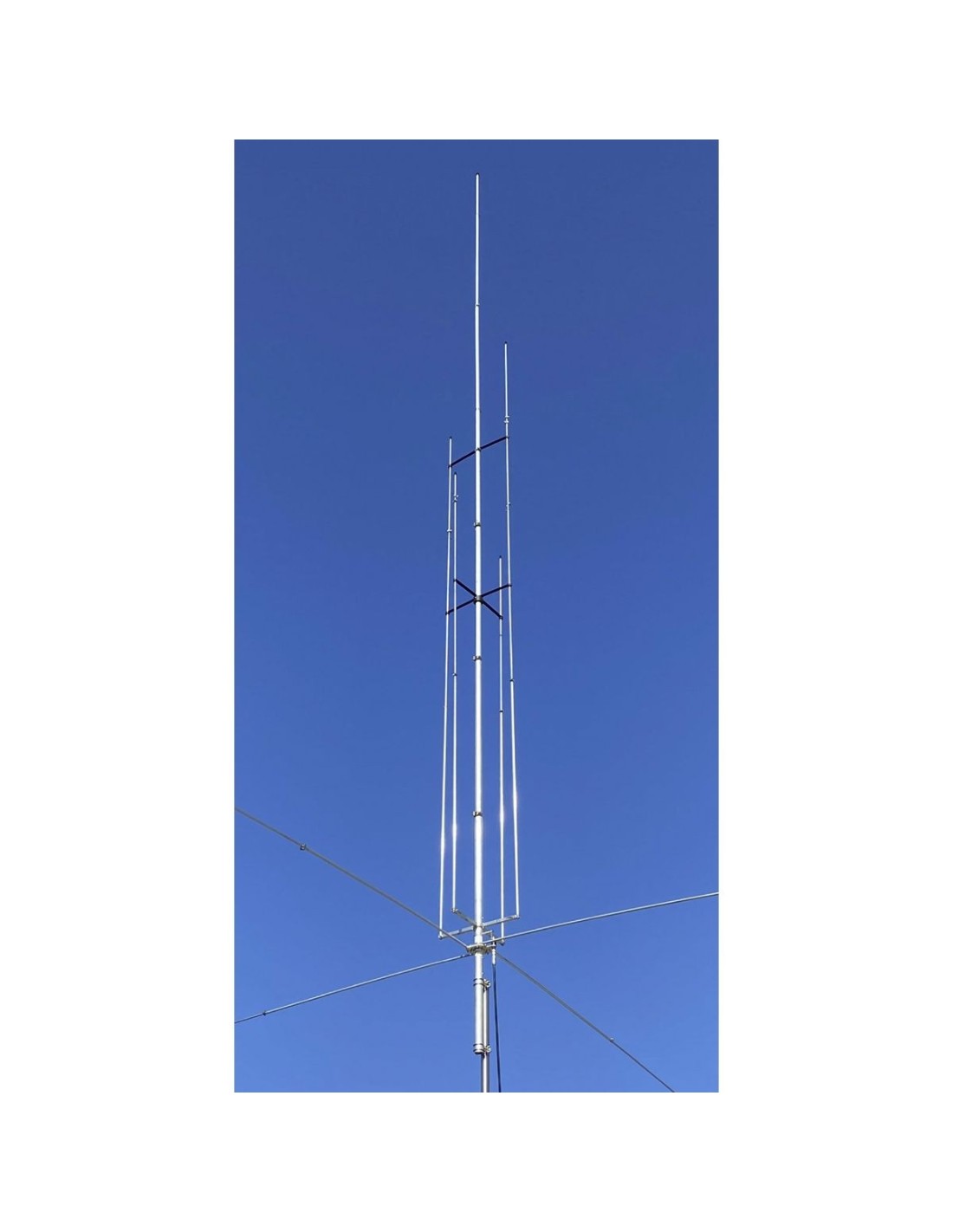 Grazioli MV6 Antena vertical HF 6 bandas de 20, 17, 15, 12, 10 y 6 metros. La antena consiste en un radiador central para la banda de 20 m, flanqueada por 4 resonadores laterales para las bandas superiores. El plan de masa está compuesto por 4 radiales horizontales de longitud igual a 2,7 m. Los resonadores laterales se mantienen en una posición paralela al radiador principal con espaciadores no conductores, mientras que la conexión conductora está en la base cercana al punto de potencia. {